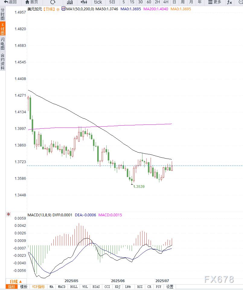 从技术图形来看,美元兑加元在1.3640区域获得支撑后反弹,目前上行目标关注1.3735阻力位,突破后将有望挑战6月高点1.3770一带。若再次回落,下方支撑见于1.3650与1.3600区域。